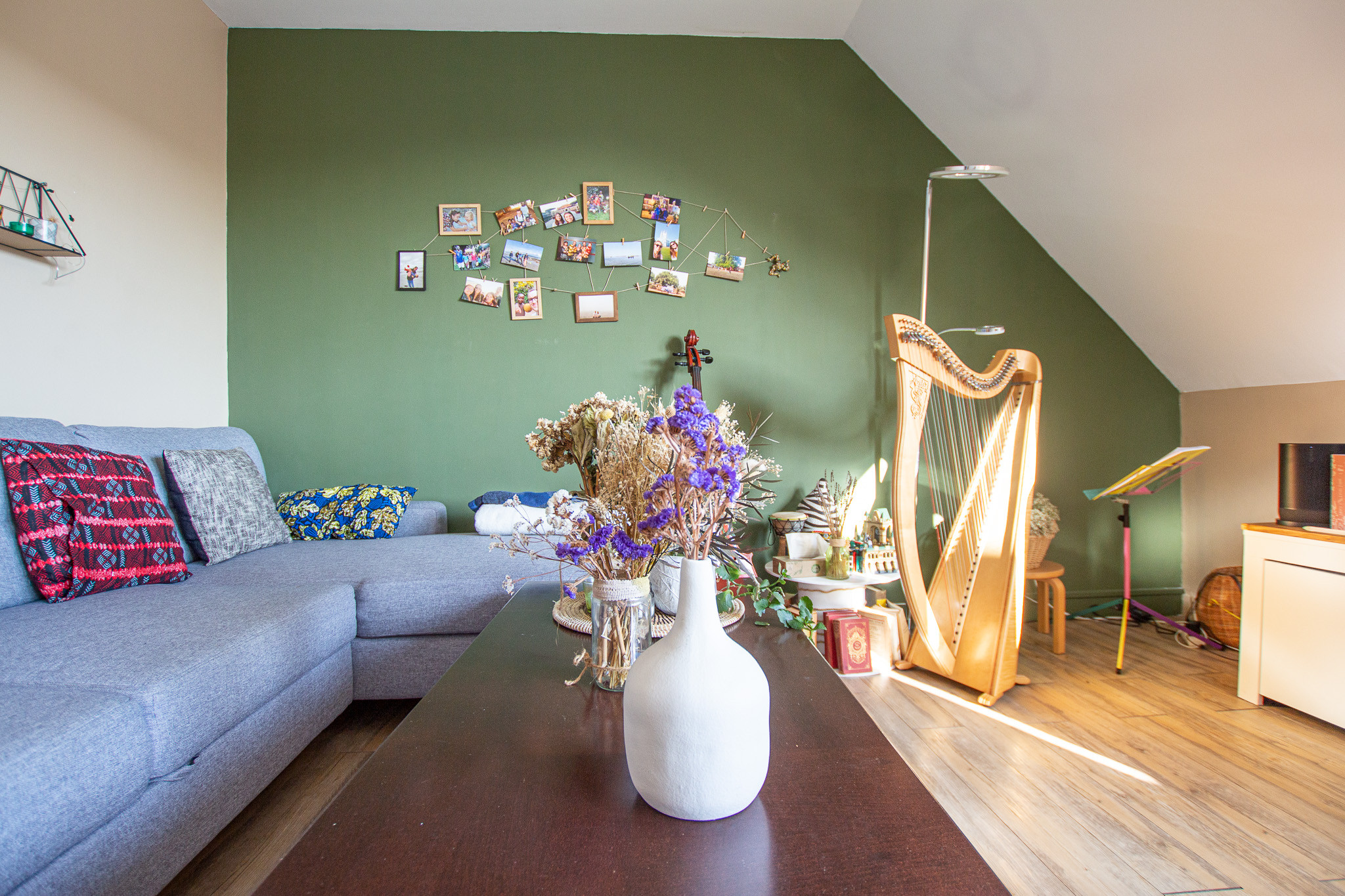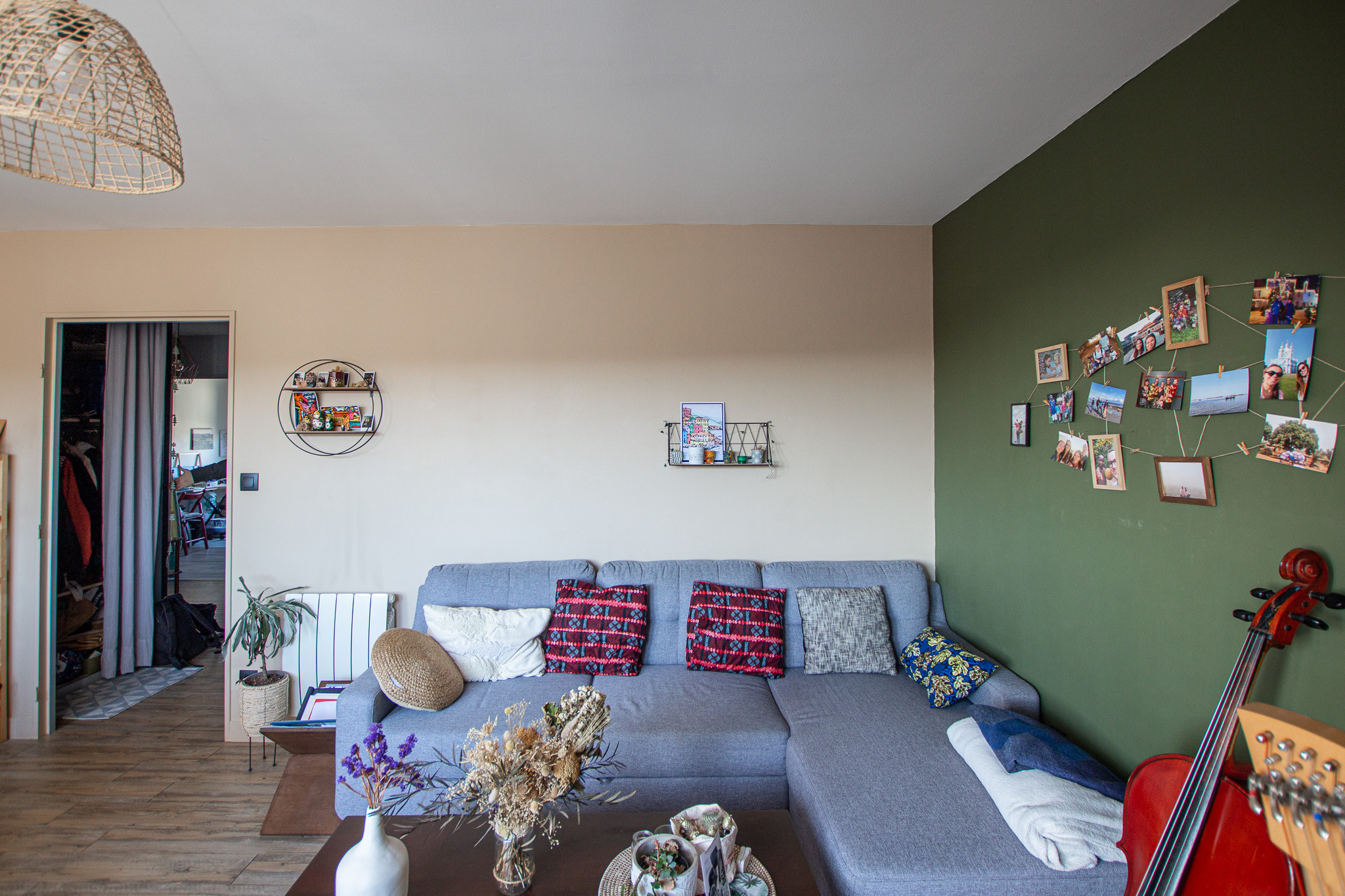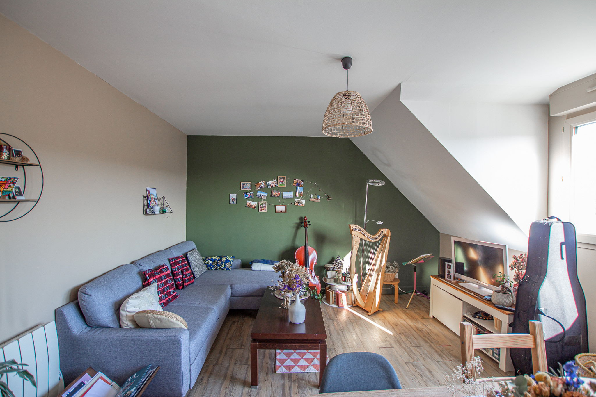 Dès l’entrée, la lumière naturelle s’impose comme le fil conducteur de la visite : le séjour, généreusement ouvert et baigné de lumière, offre une atmosphère chaleureuse.