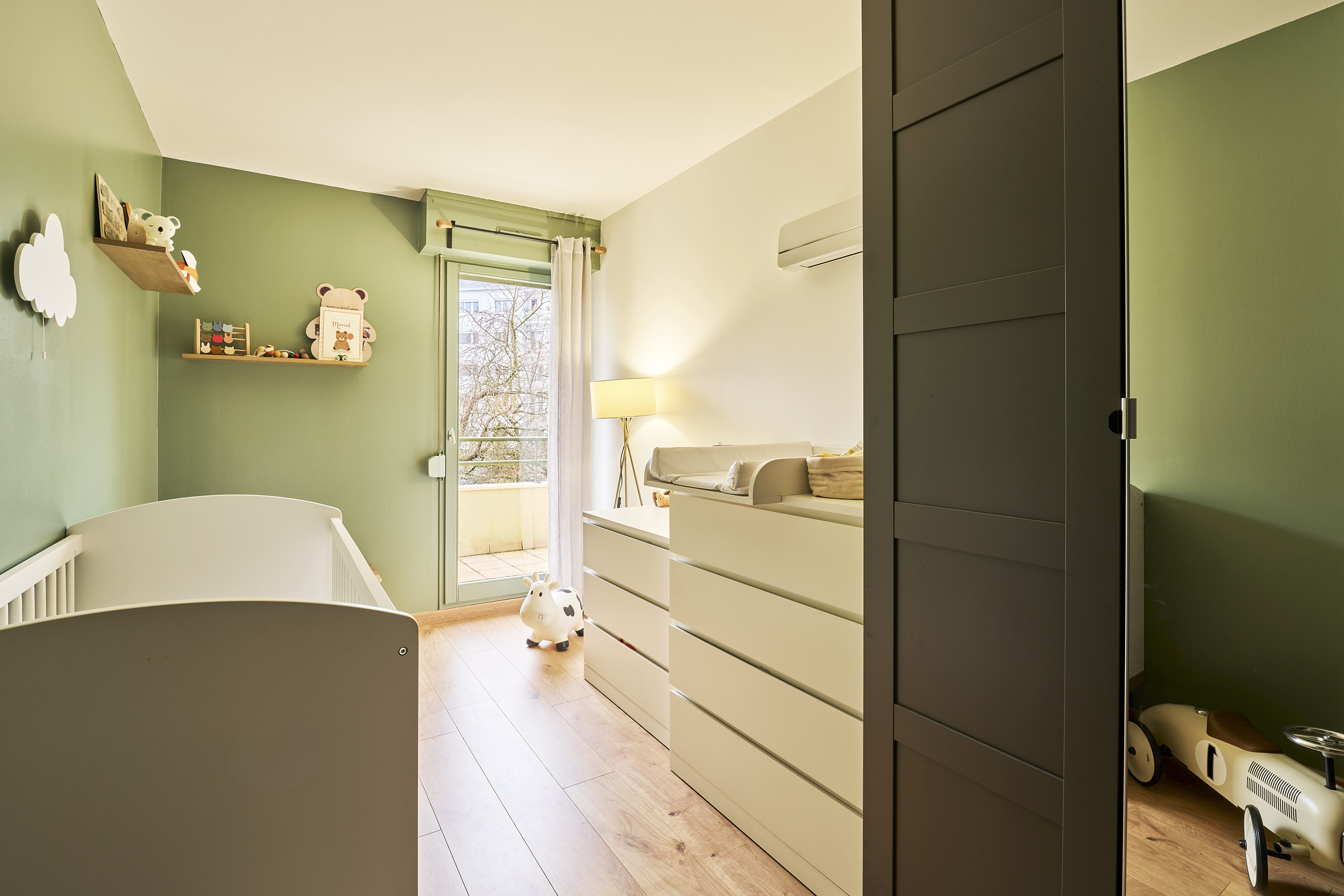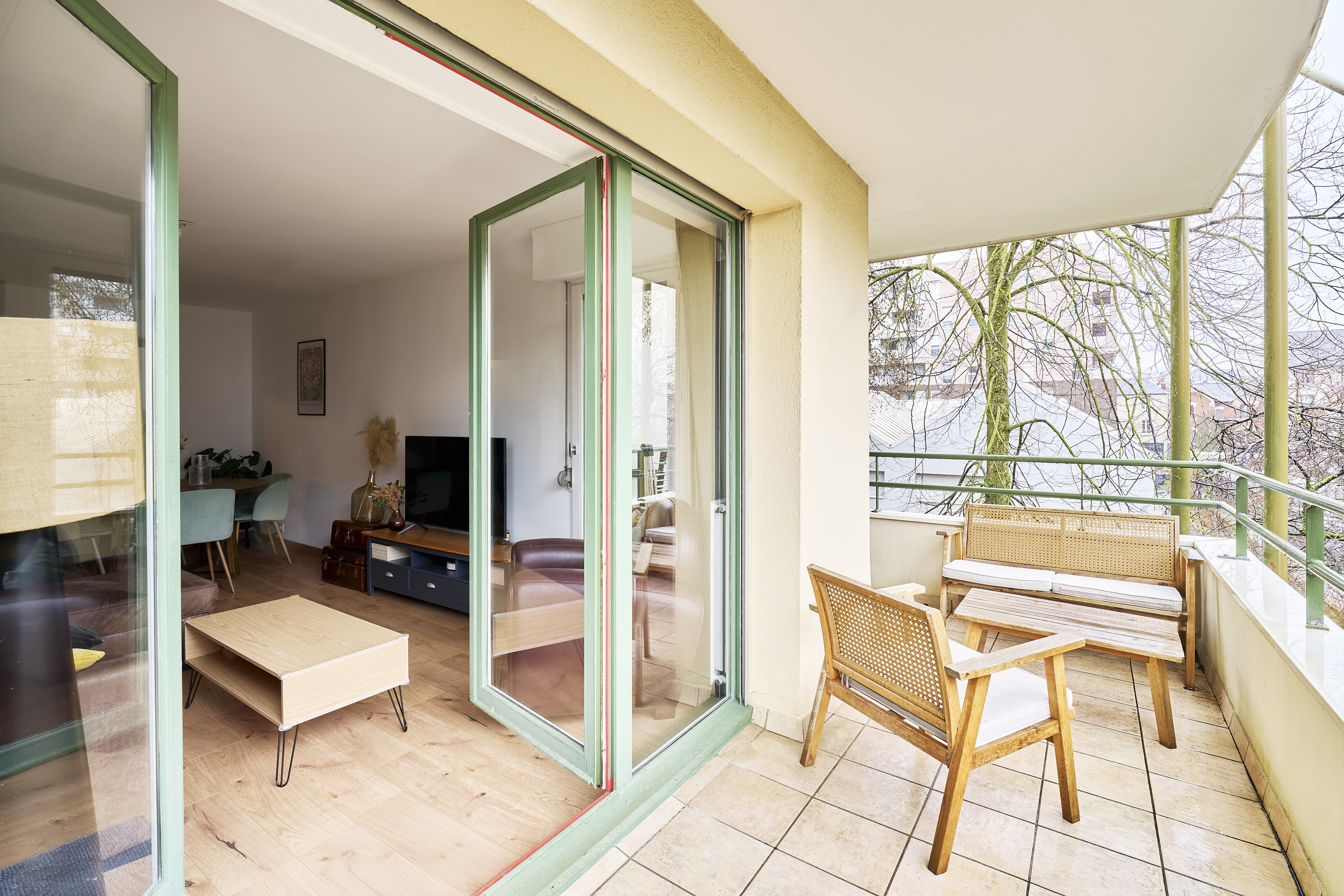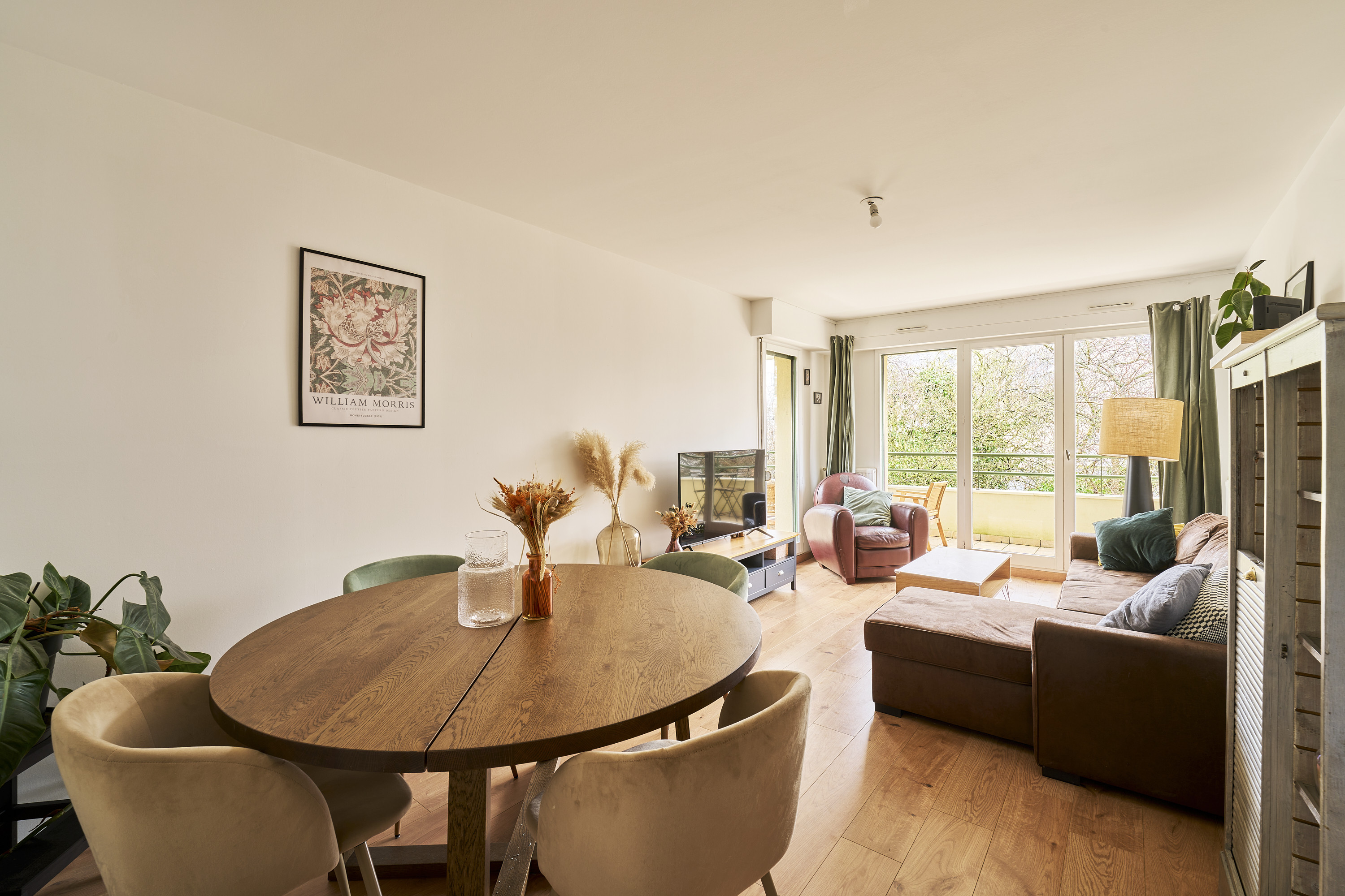 Le séjour, d’environ 20 m2, ainsi qu’une chambre, ouvrent sur un grand balcon de plus de 14 m2 orienté au sud, au pied de la promenade arborée Renée Conan.