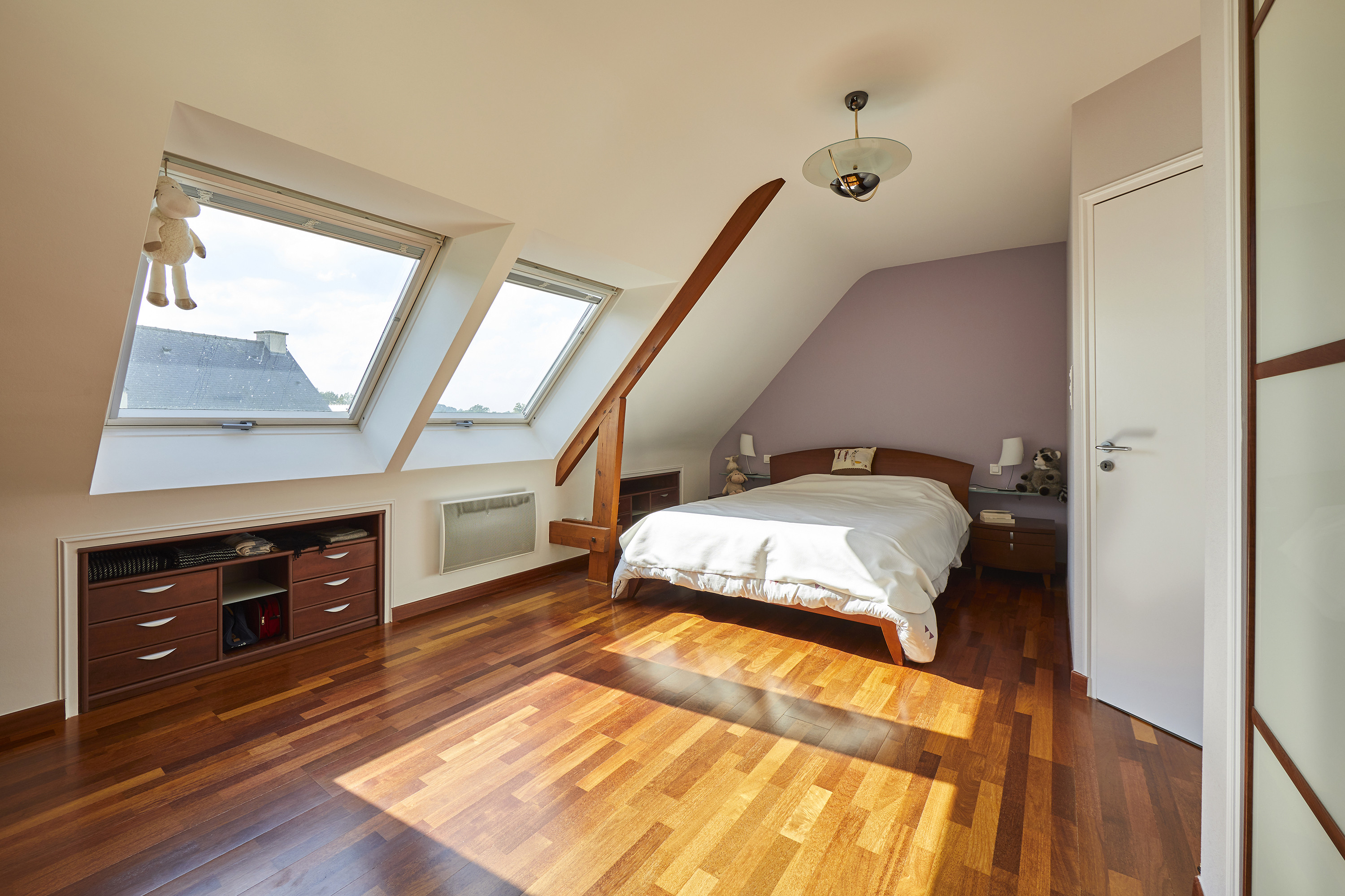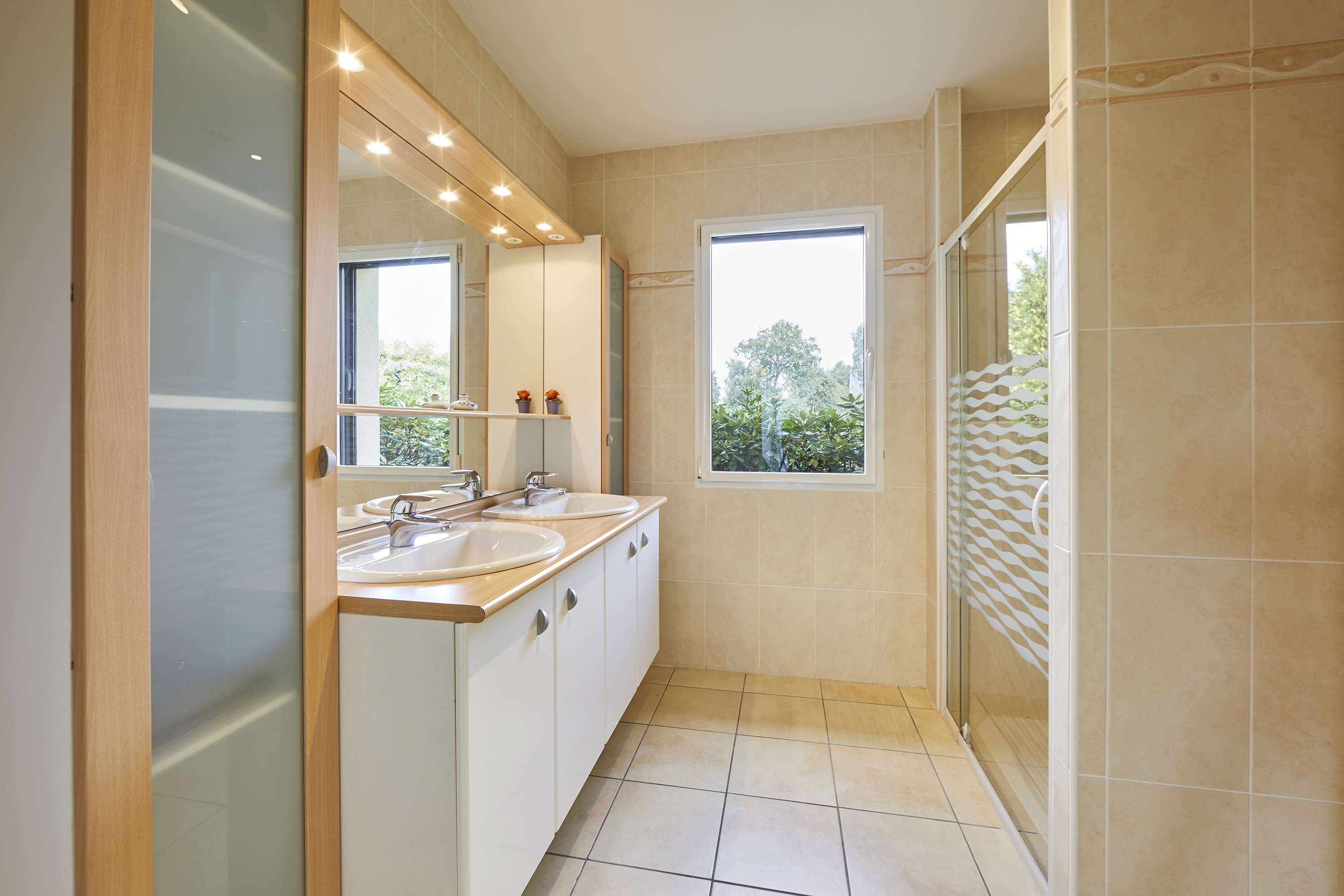Au rez-de-chaussée, vous pouvez organiser une vie de plain-pied : une véritable entrée avec placard et WC, un salon-séjour de 43m², une cuisine semi-ouverte, deux chambres de 13 m², une salle d’eau avec un second WC et deux grands espaces de dégagement pouvant être aménagés à votre guise.