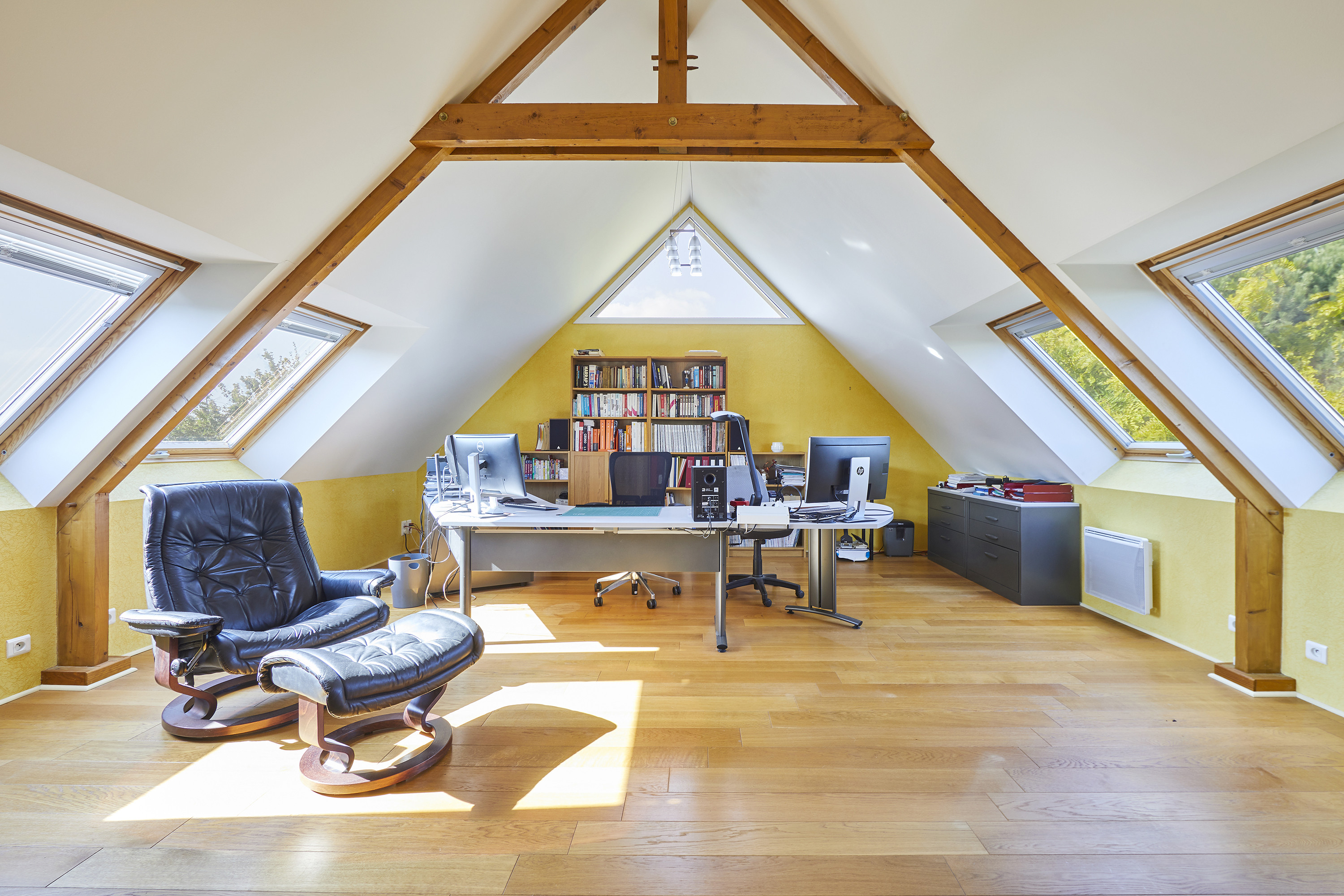 A l’étage, vous disposez de 3 chambres, dont une grande avec balcon, ainsi que d’une très grande pièce aménagée en bureau actuellement, que vous pouvez aménager également selon vos envies.
