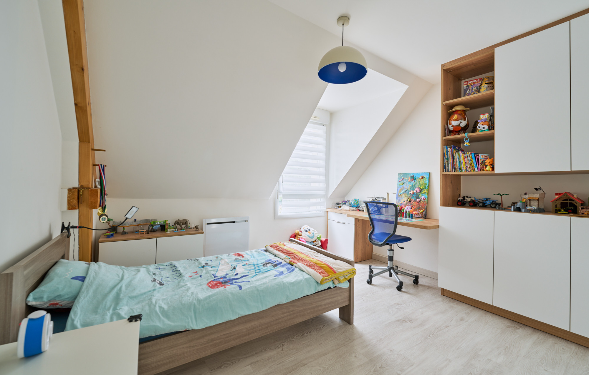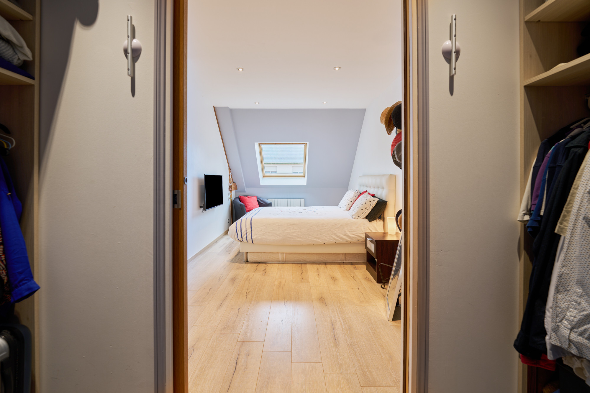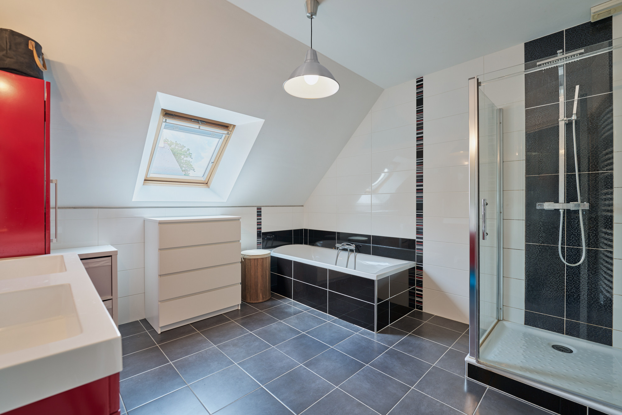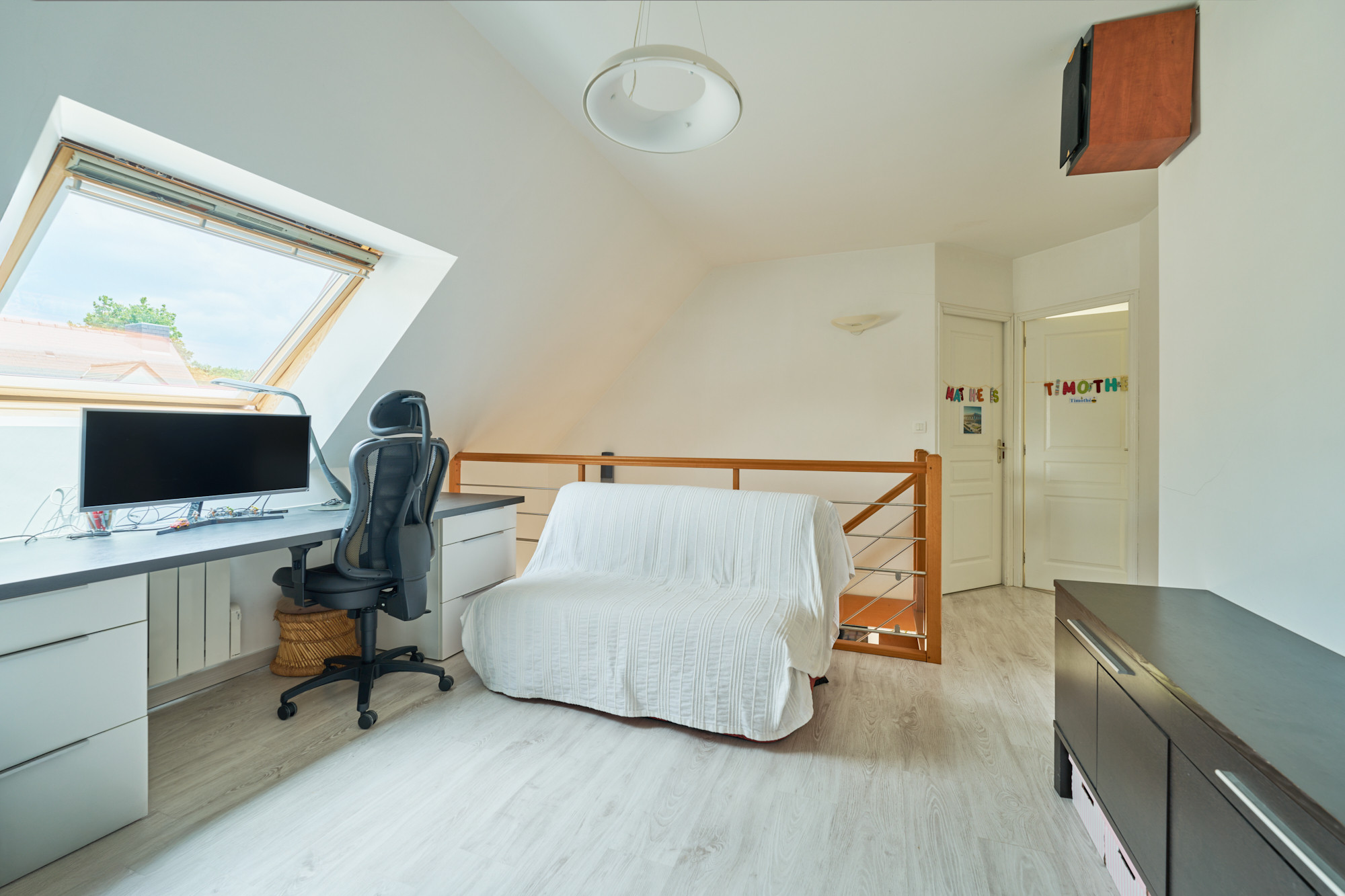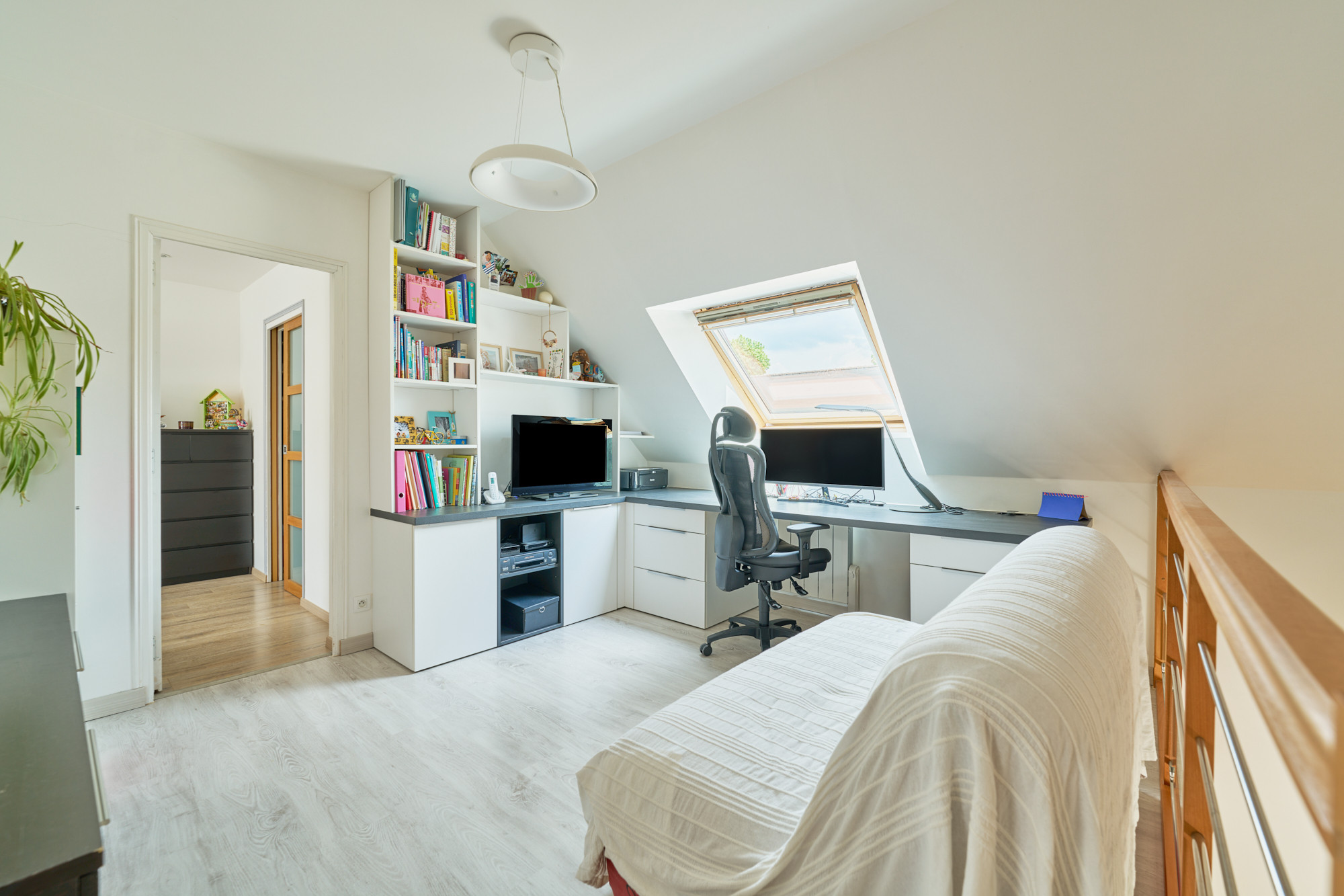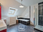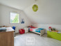 A l’étage, une vaste mezzanine accueille actuellement un bureau, lumineux grâce au large vélux. Deux belles chambres, de 13 et 14 m² chacune, disposent de placards sur-mesure récemment réalisés un agenceur. La salle de bains est également spacieuse et comprend une baignoire et une douche, ainsi qu’un meuble avec double vasque. La chambre parentale, d’environ 20 m² au sol avec son dressing indépendant, cloture la visite.