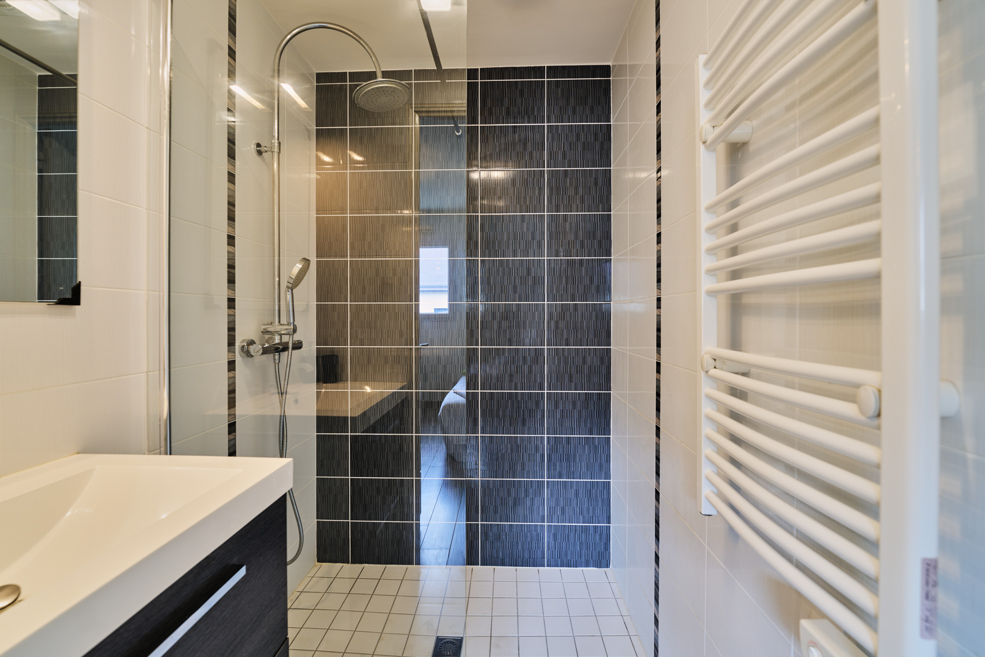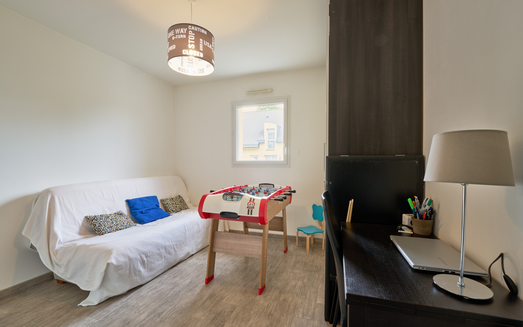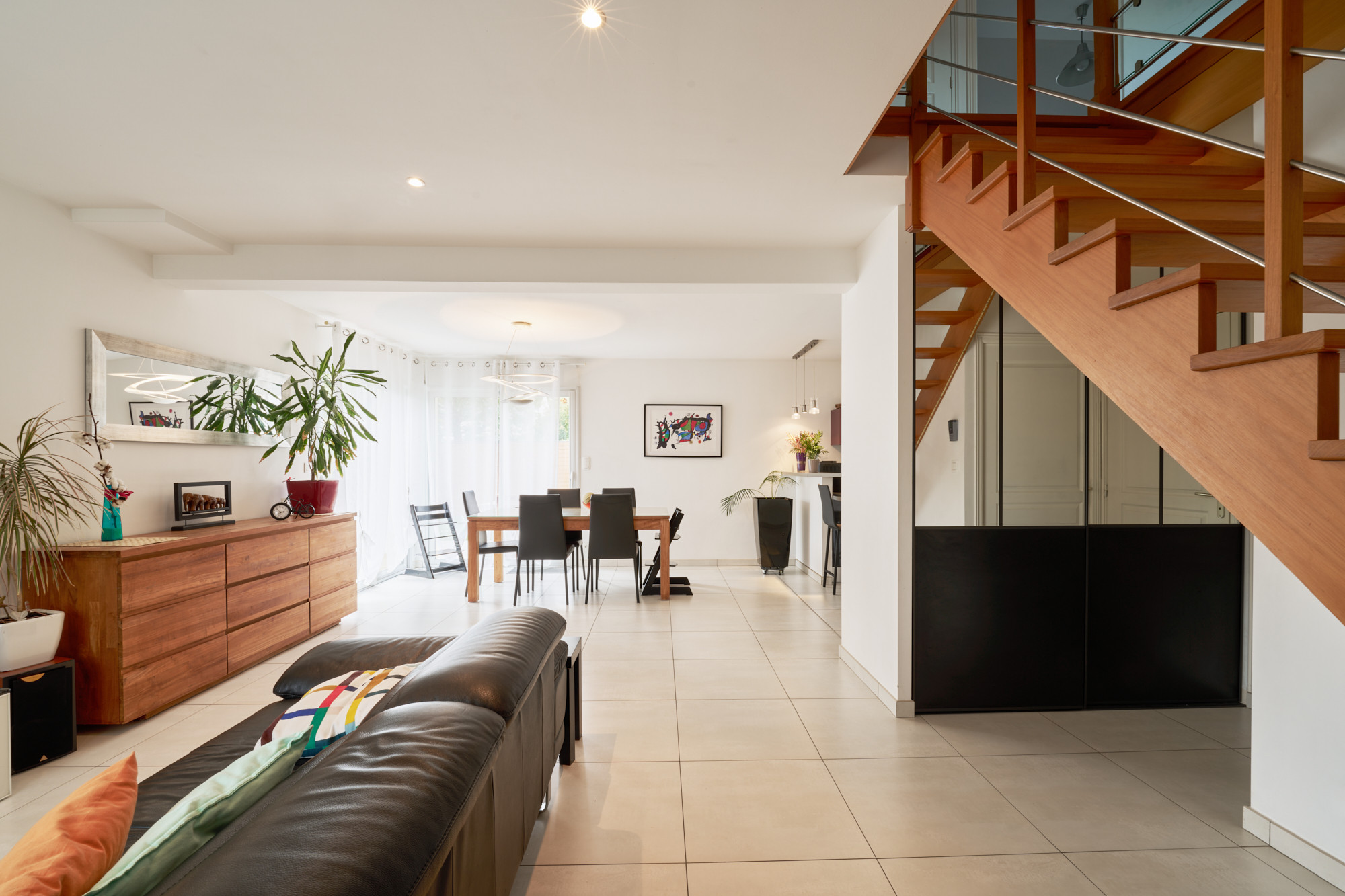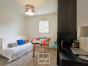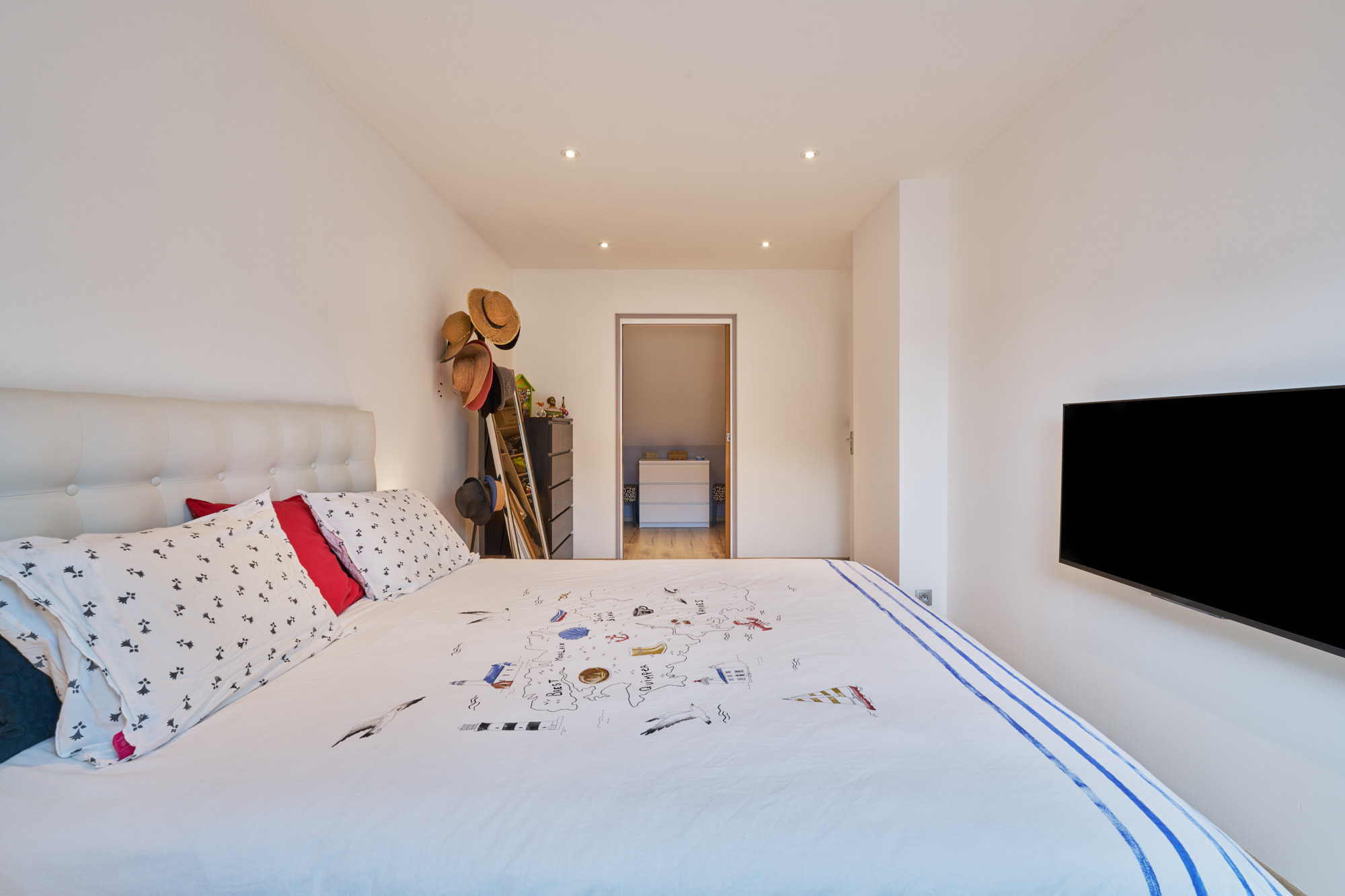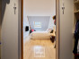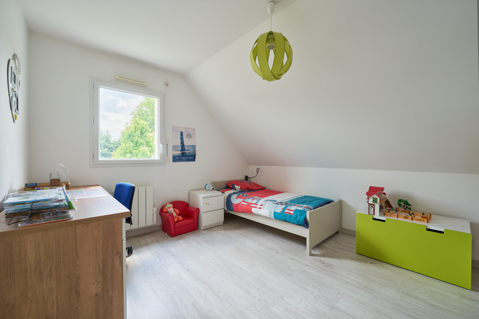 A l’étage, une vaste mezzanine accueille actuellement un bureau, lumineux grâce au large vélux. Deux belles chambres, de 13 et 14 m² chacune, disposent de placards sur-mesure récemment réalisés un agenceur. La salle de bains est également spacieuse et comprend une baignoire et une douche, ainsi qu’un meuble avec double vasque. La chambre parentale, d’environ 20 m² au sol avec son dressing indépendant, cloture la visite.