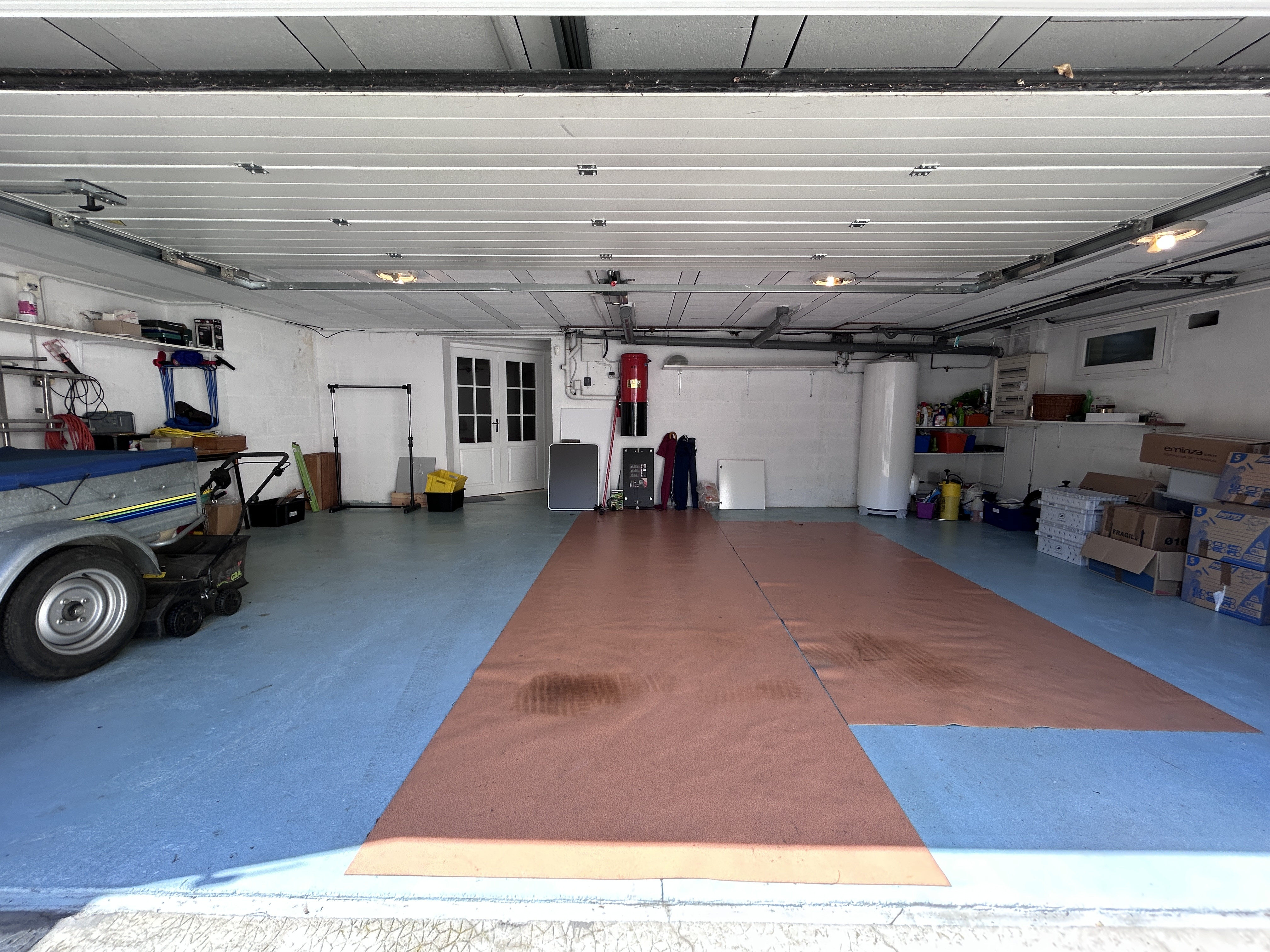 Le sous-sol, couvrant l’intégralité de la maison, abrite une salle de jeux, une pièce de stockage, une cave, ainsi qu’un double garage à porte sectionnelle.